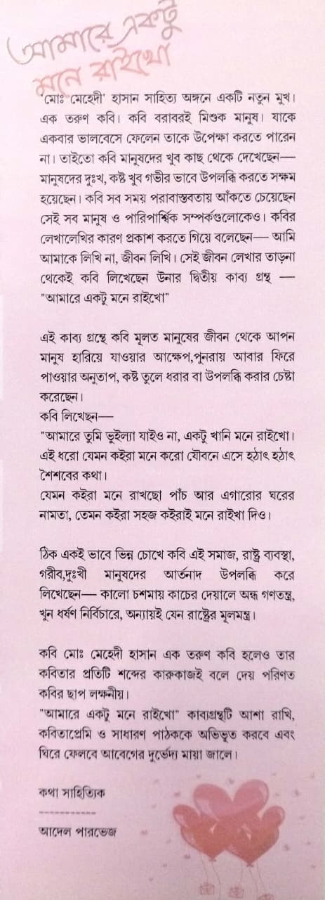 বইটির মূল বিষয়বস্তু:'আমারে একটু মনে রাইখো' বইটিতে লেখক মোঃ মেহেদী হাসান জীবনের মায়া, বিচ্ছেদ এবং স্মৃতির এক অনন্য আখ্যান তুলে ধরেছেন। আমাদের যান্ত্রিক জীবনে আমরা প্রতিনিয়ত কত মানুষকে হারিয়ে ফেলি, কিন্তু দিনশেষে আমরা শুধু এটুকুই চাই—কেউ যেন আমাদের একটু মনে রাখে। ❤️