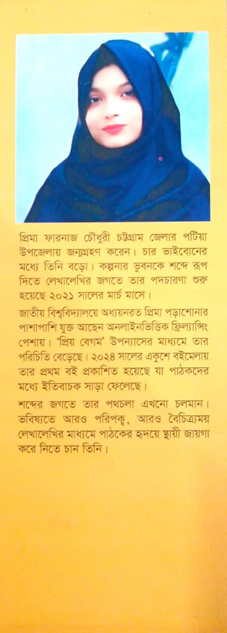 প্রিমা ফারনাজ চৌধুরী-এর অসাধারণ লেখনীতে 'প্রিয় বেগম' বইটি পাঠককে নিয়ে যায় আভিজাত্য আর আবেগের এক অন্যরকম জগতে। এটি কেবল একটি উপন্যাস নয়, বরং নারীর মর্যাদা, সংগ্রাম এবং ভালোবাসার এক জীবন্ত প্রতিচ্ছবি।